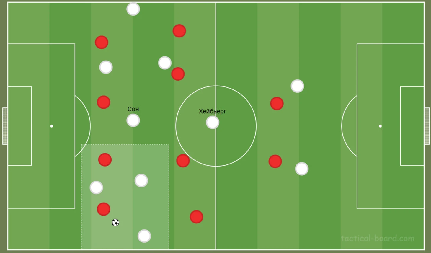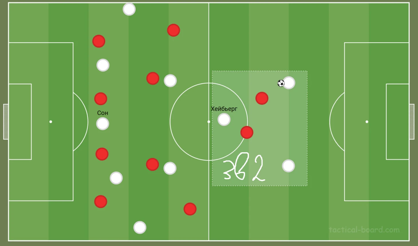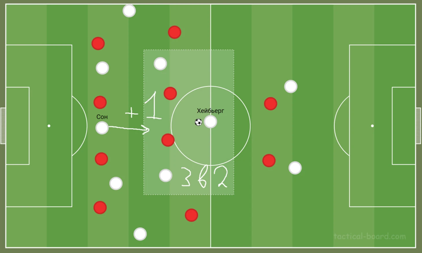 Когда опорника нашли, идем дальше к следующей линии и за счёт этих двух тех самых игроков, которые находятся выше опорника снова ситуация 3 в 2, задача найти снова лишнего, причем даже и 4 в 2, потому что приходит Сон, и получается своего рода квадрат 4-2, задача которого пройти и эту линию обороны. И как там уже примут решение разыграть этот квадрат зависит от действий защищающих и что они перекроют. Вот смотрите.