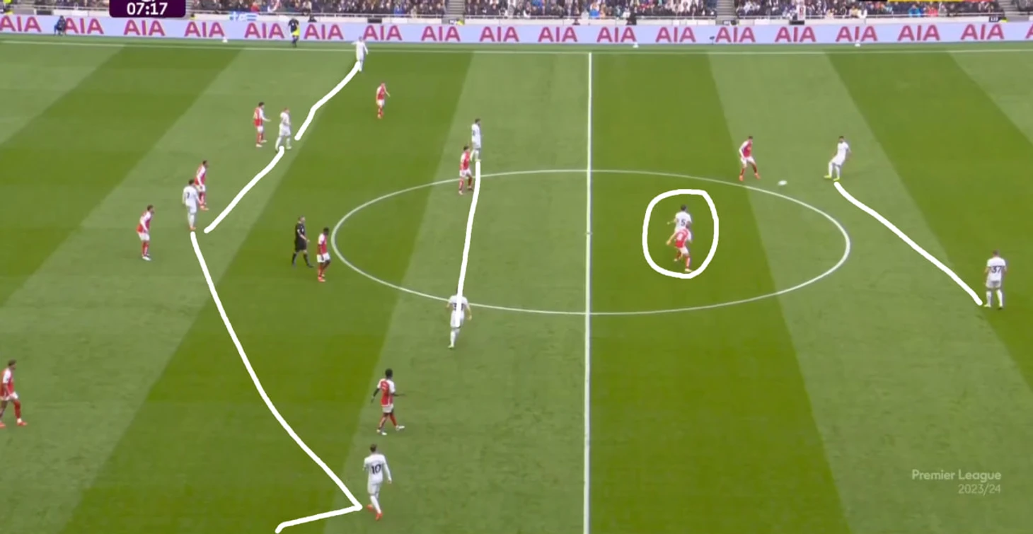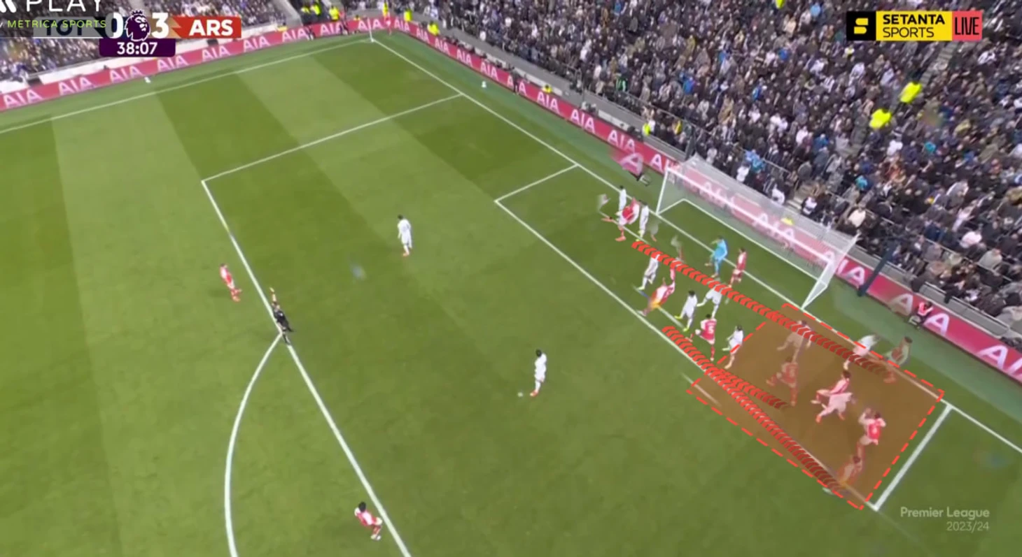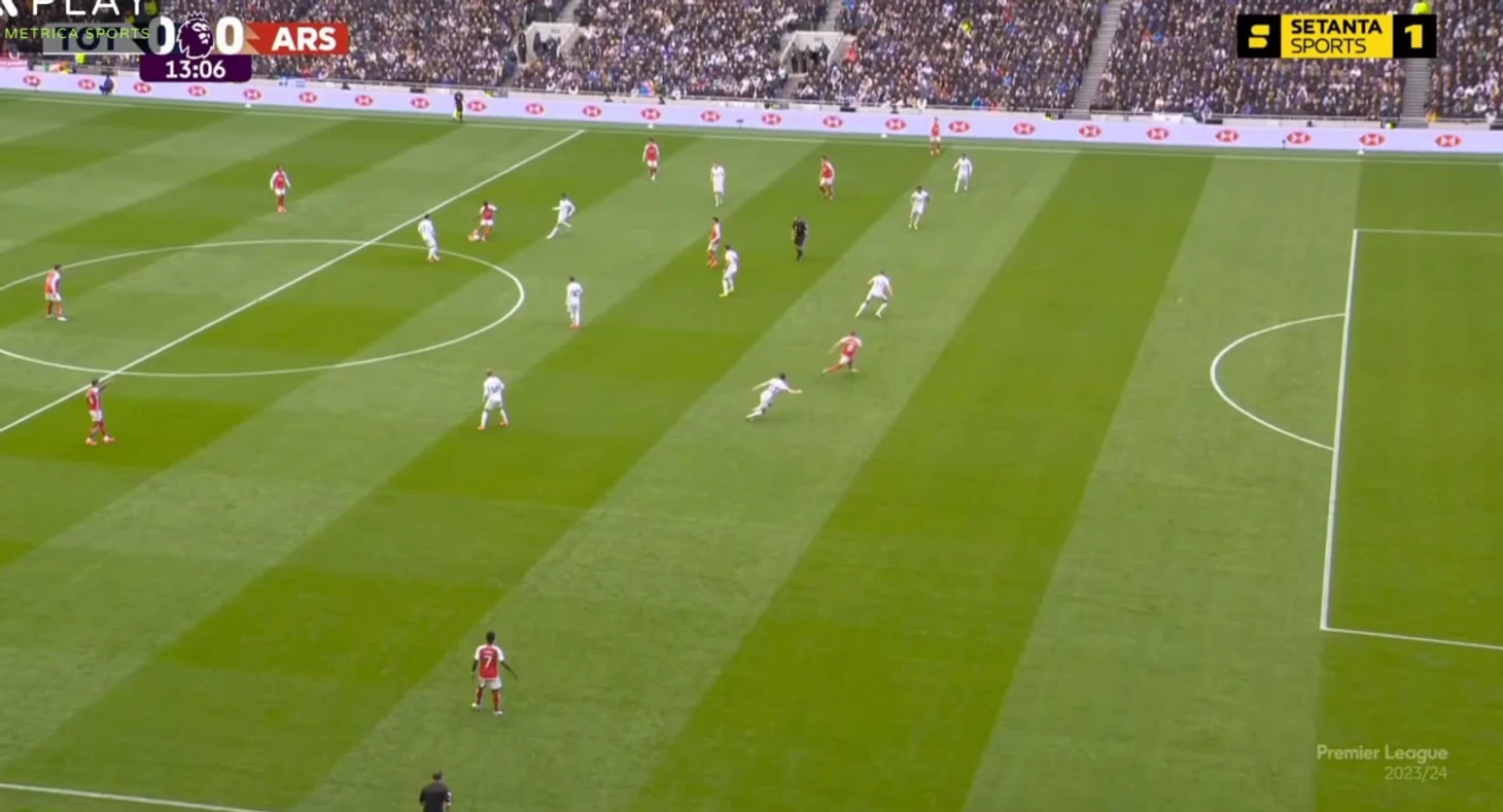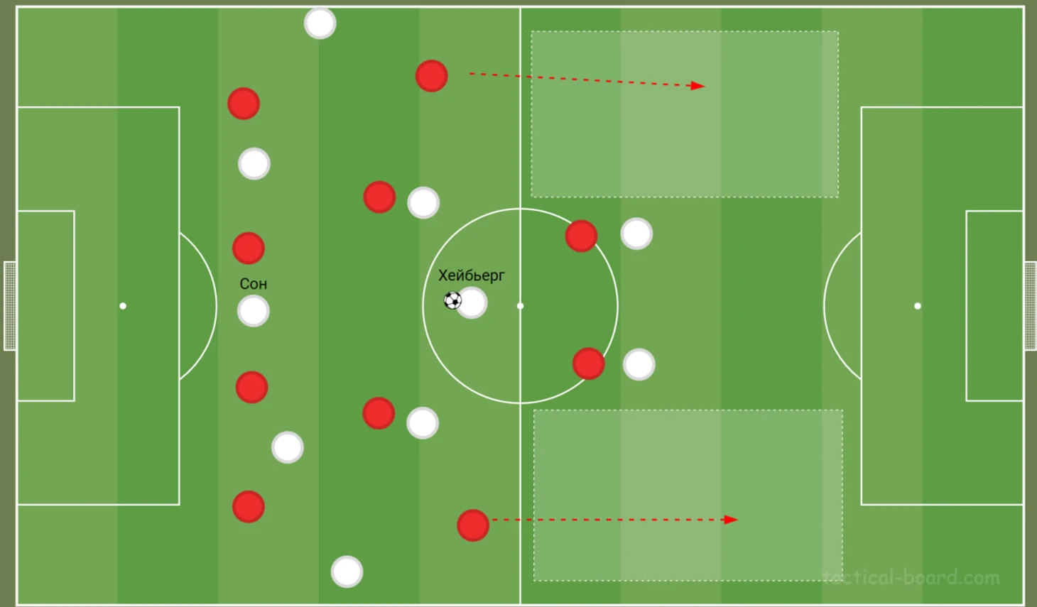Очень интересное построение у Постекоглу, которое позволяет вот так поэтапно с большинством преодолевать линии обороны. Но это на доске все так красиво, в игре понятно, что у игроков защиты есть ноги для перехвата и сами они двигаются быстрее, поэтому ТТХ не всегда удается это все воплотить, но когда получается, то выглядит красиво. Тух-тух-тух и мяч на фланге и готовится подача или прострел. Теперь к минусам этой расстановки. Не буду ходить вокруг да около. Сзади остается 2 защитника и опорный, который может периодически застревать вверху это очень рискованно. Потому что у Арсенала итак 2 форварда, с которыми играли два центральных защитника ТТХ, так еще эти зоны были оголены, потому что игроки были в структуре.