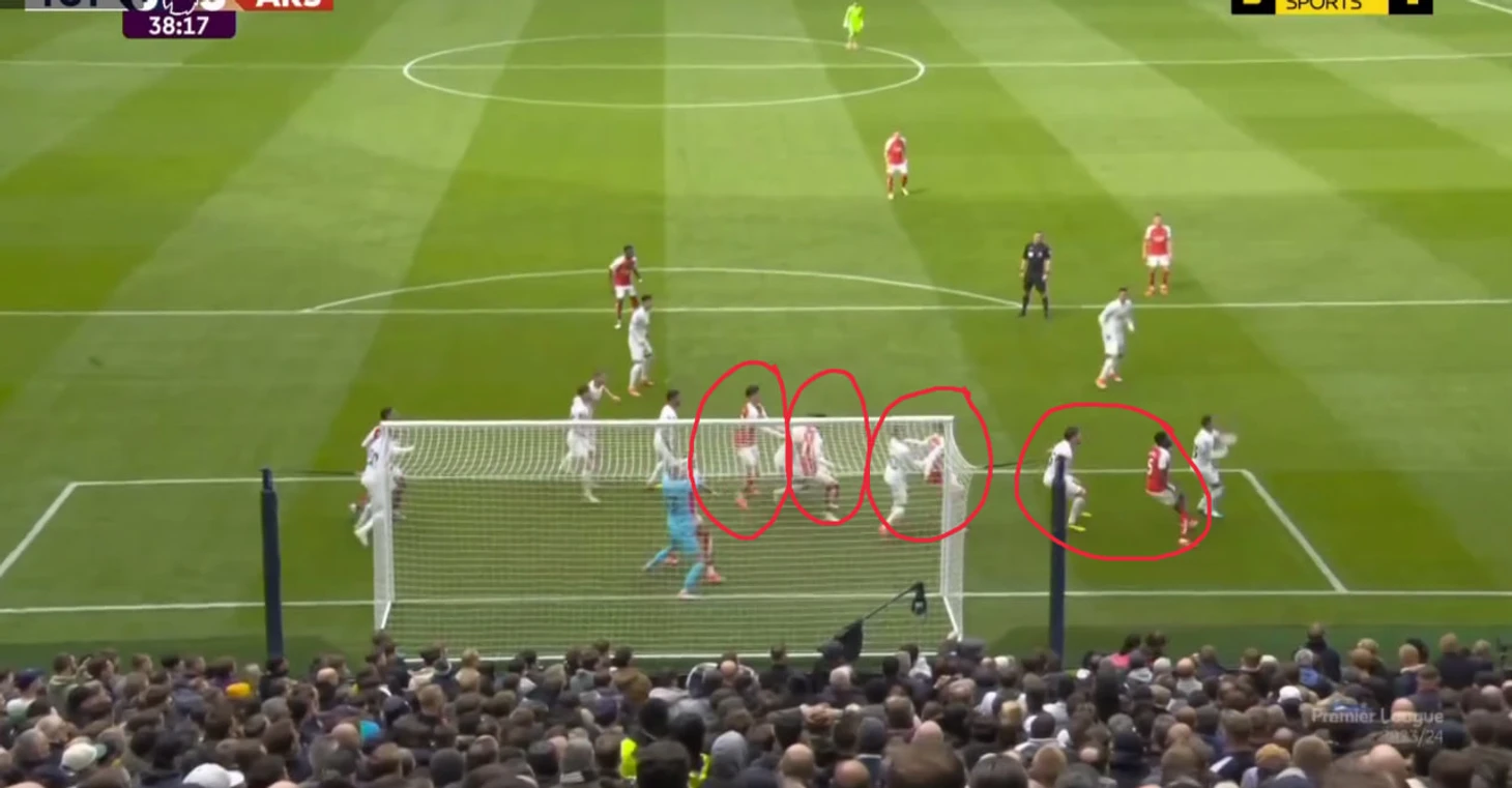 Не сказать, что Арсенал прям выдал в атаке что-то невероятное. Они, как я уже и говорил, воспользовались слабой точкой Тоттенхэма в контратаке. Ну и стандарты, в этом сезоне в Арсенале с ними все в порядке. Смотрите в чем идея. Тоттенхэм обороняется зонно, каждый игрок ответственен за свою зону и соответственно играет в ней. Арсенал же применил стратегию против такой зонной обороны. Сначала все игроки строились на дальней штанге. Задача была прибежать за доли секунды до подачи в зону к каждому игроку и сыграть перед ним. Вот как-то так.