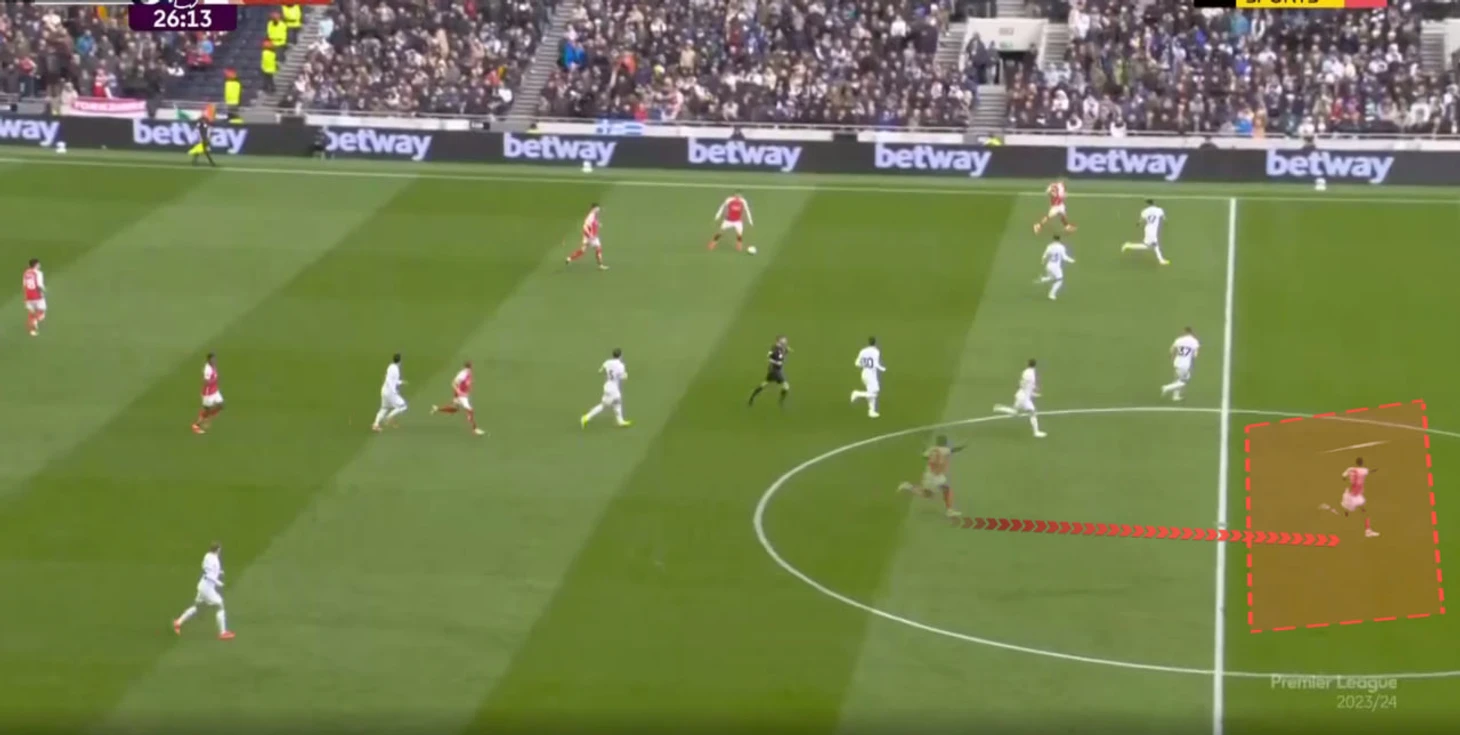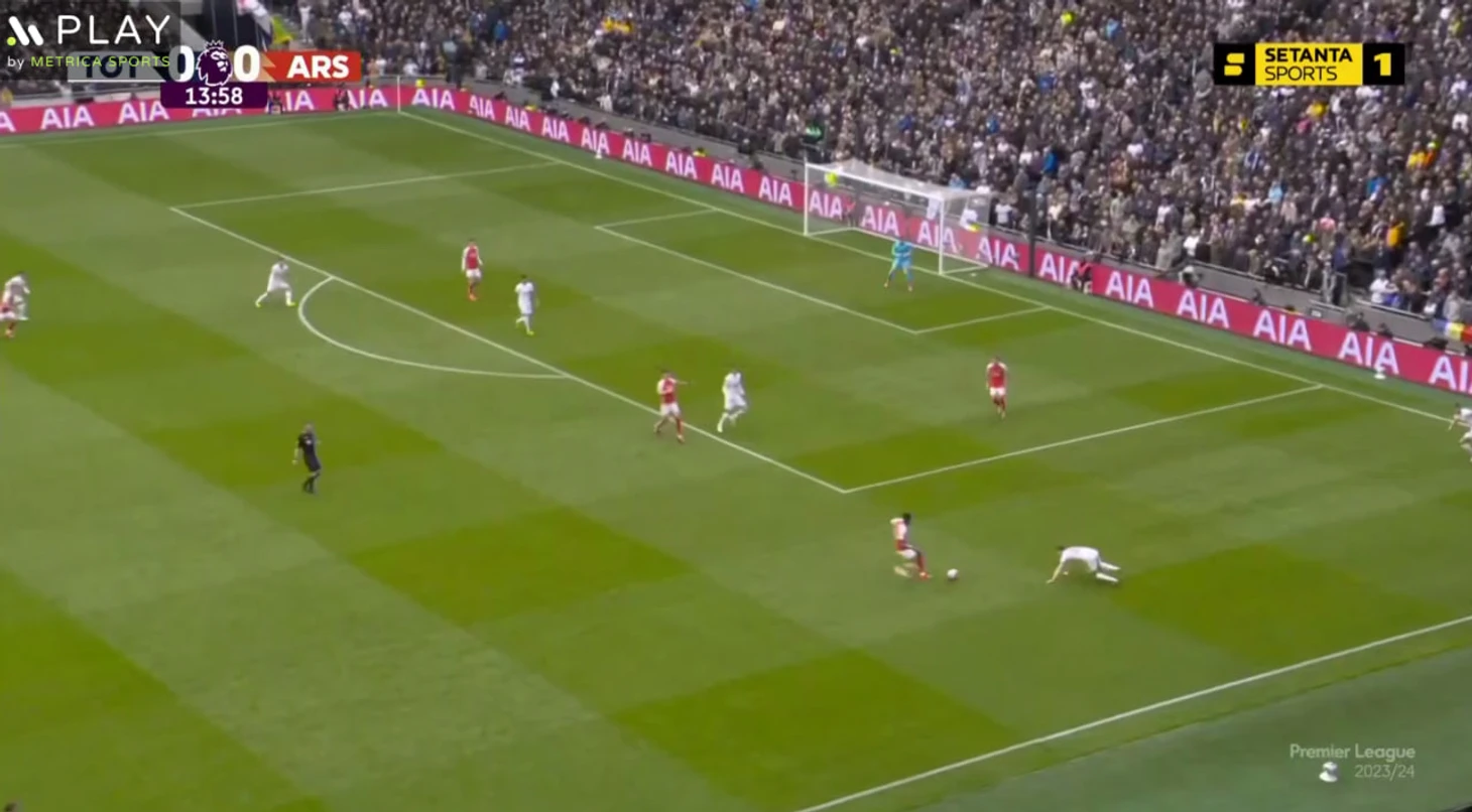 В общем как бы Тоттенхэм не старался не терять мяч, все равно рано или поздно они получили эту контратаку, именно в эту зону, куда и вылетел Сака и забил второй гол.