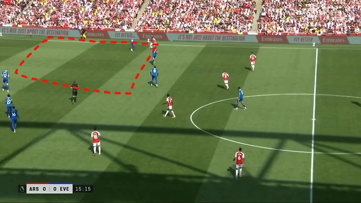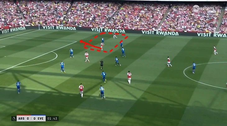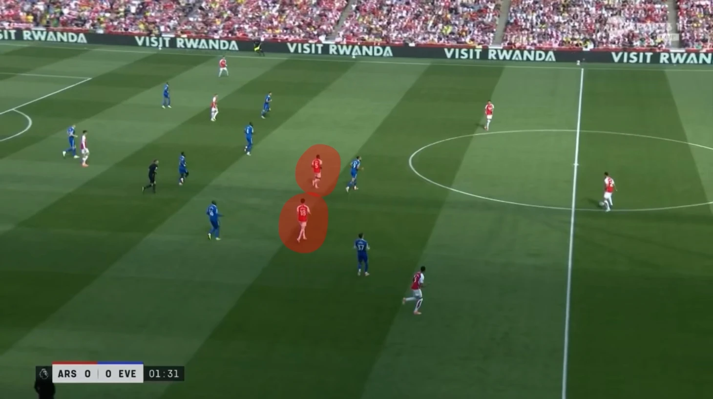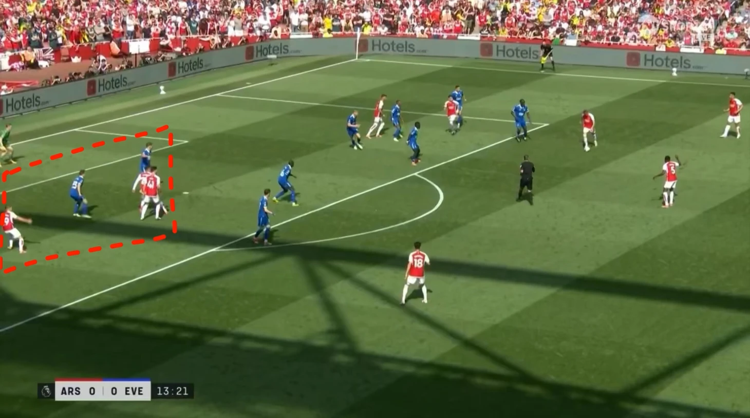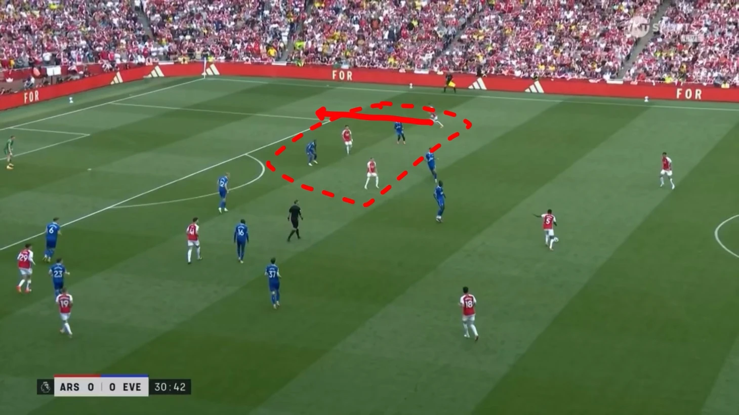 На этом канониры не остановились, Эдегор решил предложить такой обороне еще один вариант, когда он пойдет в опорную зону, ближе к центральным защитникам. И опорники Эвертона снова ведутся на такую ловушку, они вроде и пошли за норвежцем, но смотрите какая зона зато у Мартинелли, против которого уже не молодой Янг.