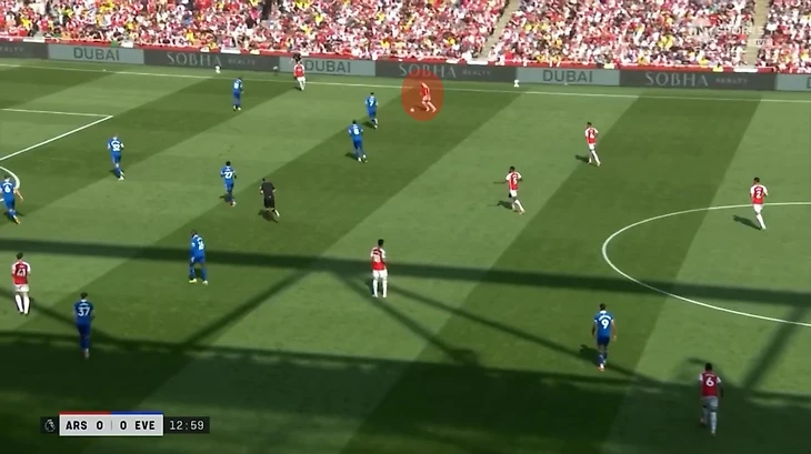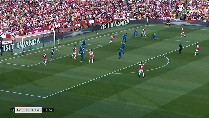 Потому что посмотрите, что образуется в зоне дальней штанге, мало того, что там 3 в 2, так еще два не самых маленьких Хавертц и Райс, и Эдегор сразу же направляет туда передачу и тем самым Арсенал создает голевой момент.