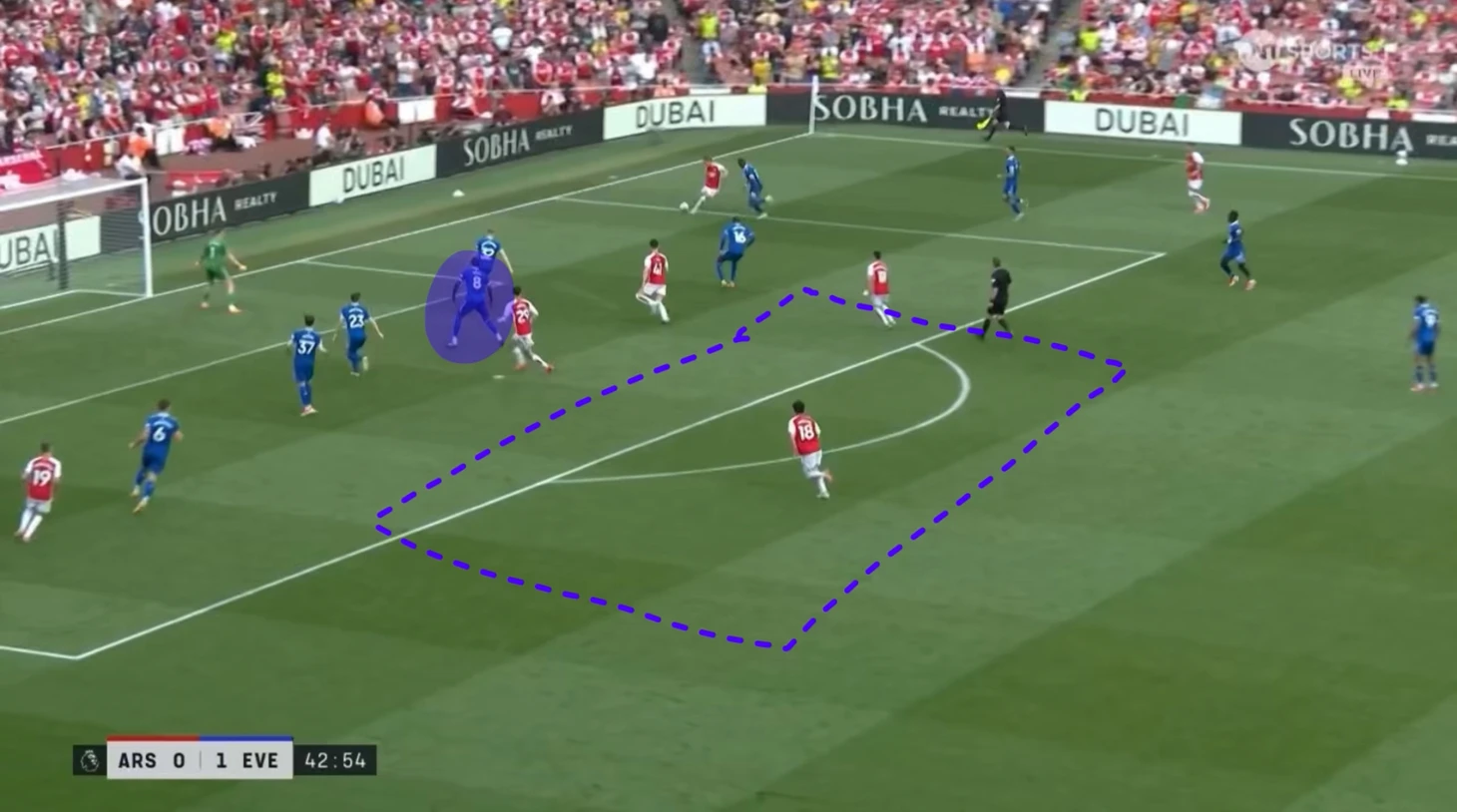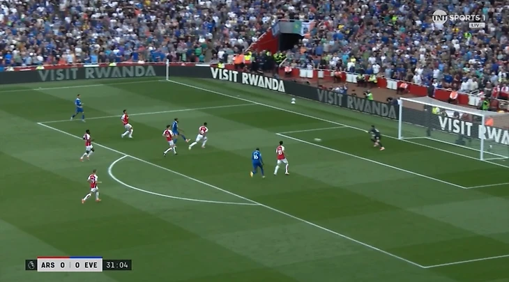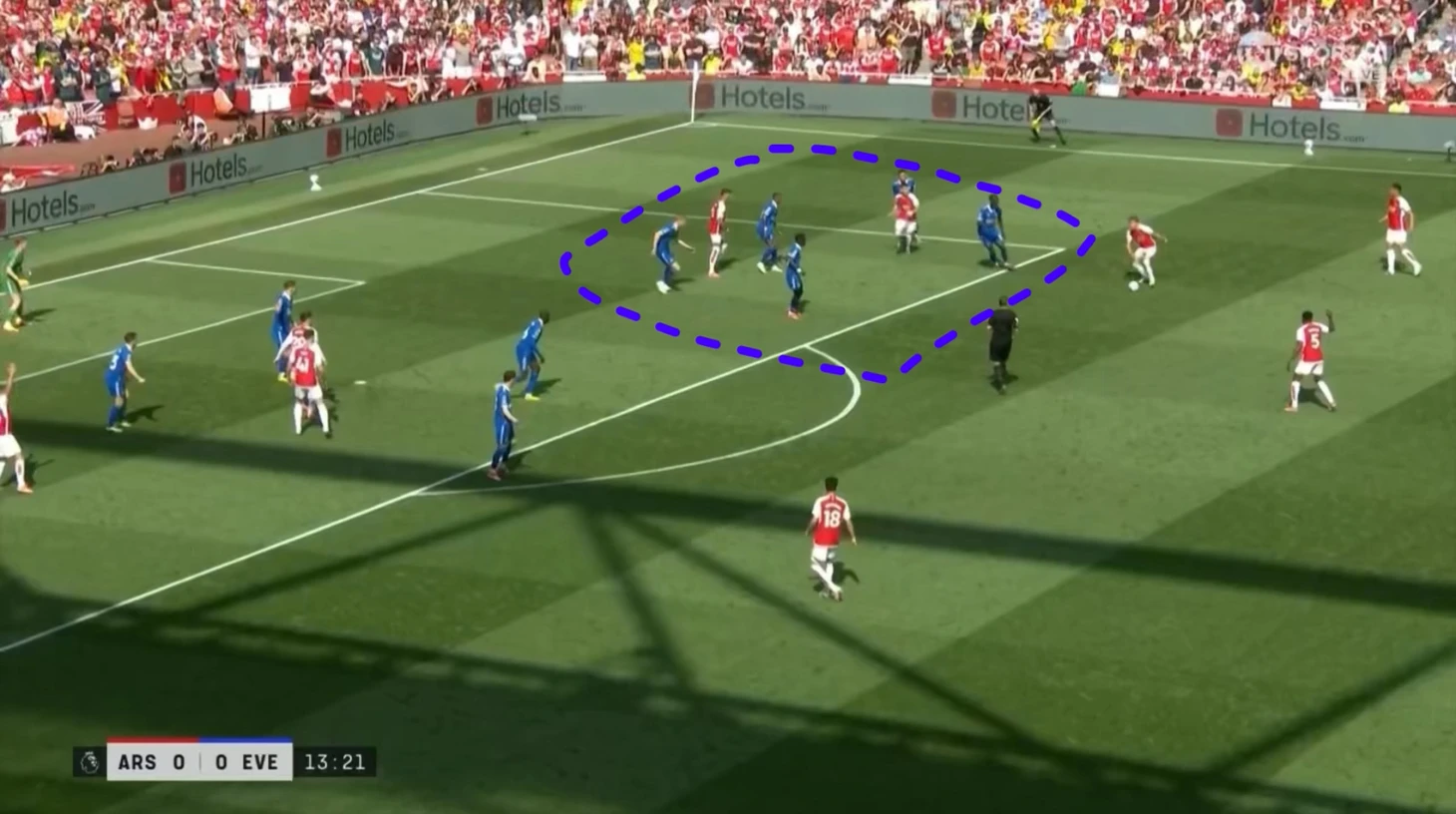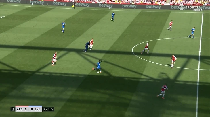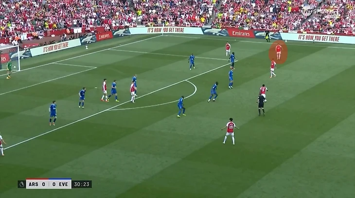 А дальше опорник Эвертона с испугу, что столько игроков на левом фланге взял и сел в линию защиту, а остальные опорники были также отвлечены движениями на фланге. Отсюда Томияясу и оказался совсем один и забил, все звезды сошлись для Арсенала и получился гол.
