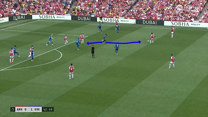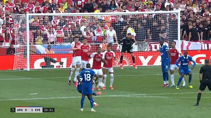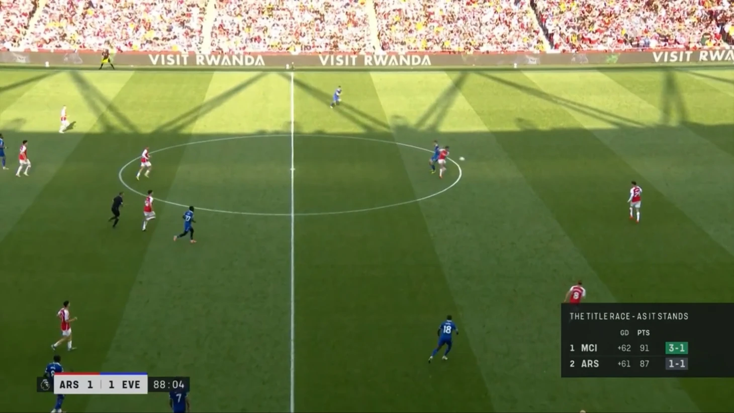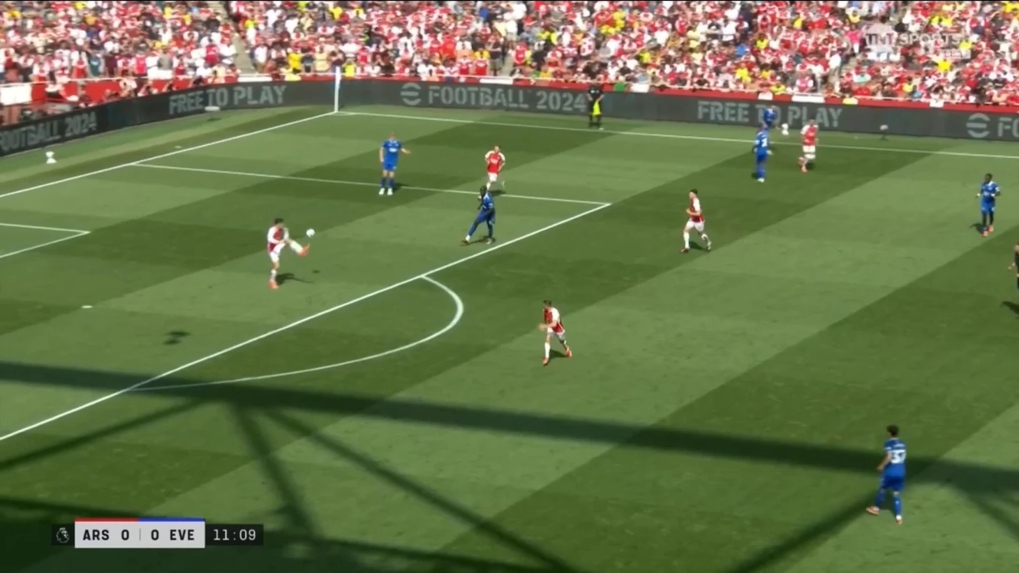 А дальше опорник Эвертона с испугу, что столько игроков на левом фланге взял и сел в линию защиту, а остальные опорники были также отвлечены движениями на фланге. Отсюда Томияясу и оказался совсем один и забил, все звезды сошлись для Арсенала и получился гол.
