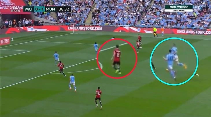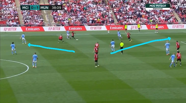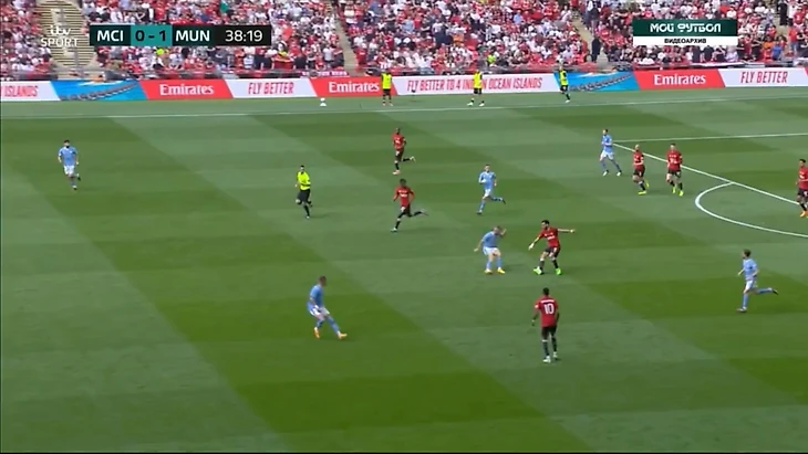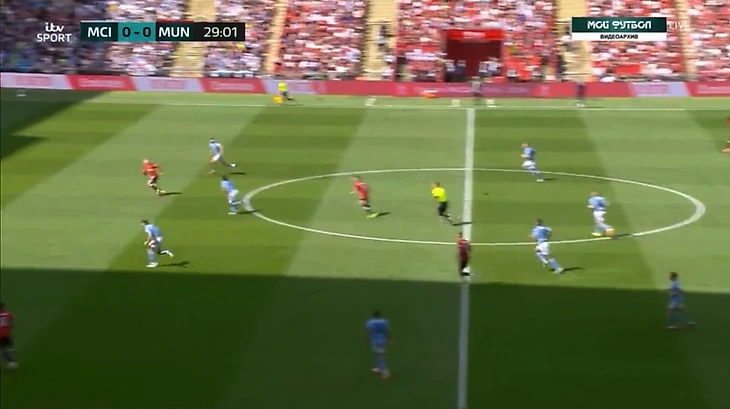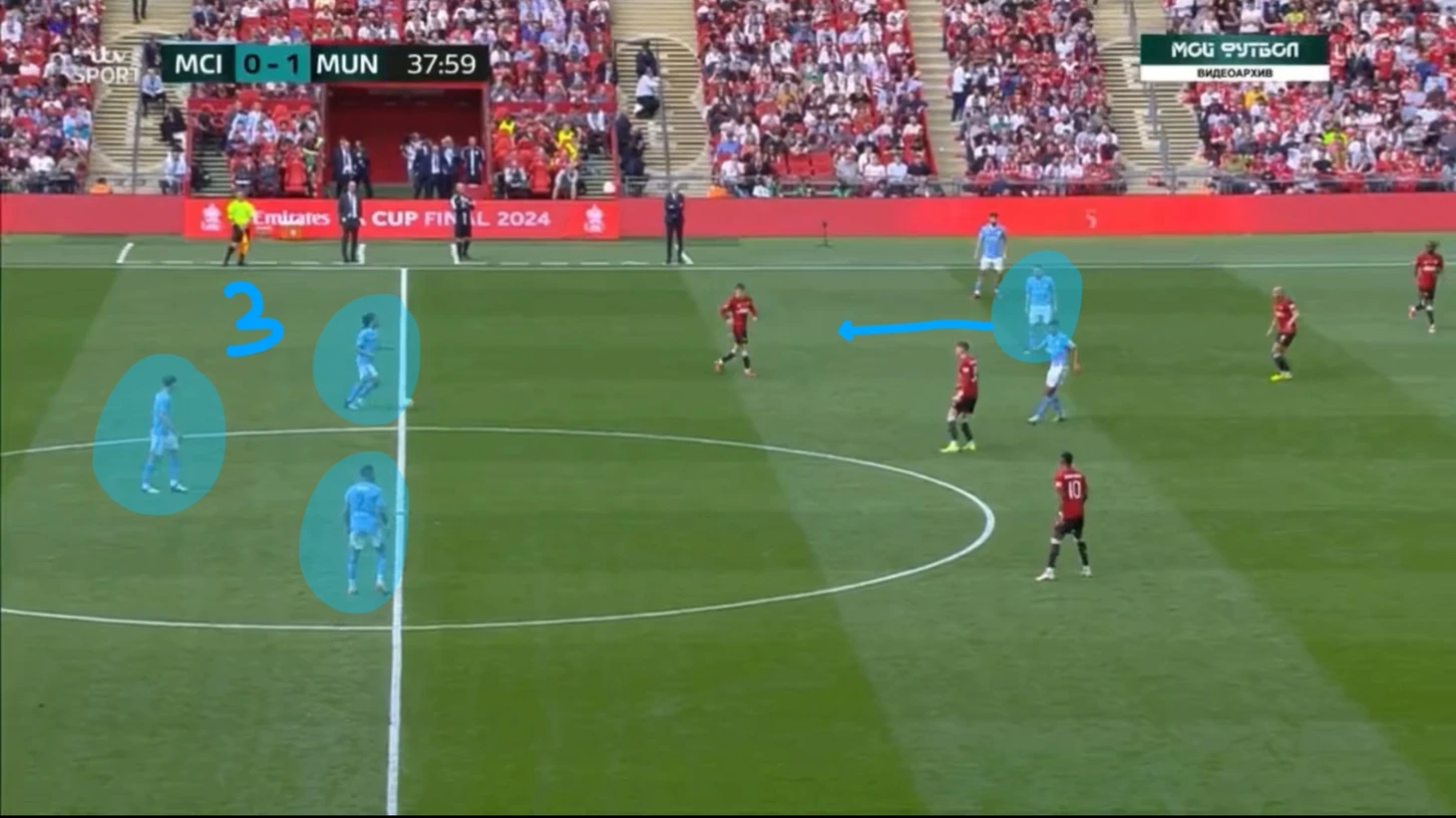 Финал кубка Англии. В соперниках МЮ, проводящий ужасный сезон. Что может быть легче, чем забрать очередной кубок? Сити начали в своем стиле. То же владение, та же структура 3-2-5, то же владение, те же вбегания и комбинации, что справа. Также крутое взаимодействие Де Брюйне и Фодена, и казалось, что лишь вопрос времени когда эта система даст голы. Но проблема в том, что времени в кубке нет, там есть только 90 минут и нет шанса исправить ситуацию как в лиге.