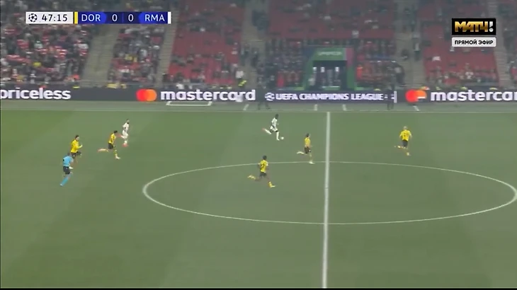 Ну и дальше все по стандарту у Реала, слева с первых минут свое присутствие обозначил Винисиус, кто бы, что не говорил, бразилец просто отвозил правого защитника Боруссии, и я не знаю, что бы было если бы не один опытный господин в защите у шмелей. Именно Матс Хуммельс постоянно страховал своего защитника, пока того очередной раз обыгрывал этот быстроногий бразилец. Невероятный матч провел Хуммельс и еще раз доказал, что может аукнуться Нагельсману за не вызов в сборную на Евро.