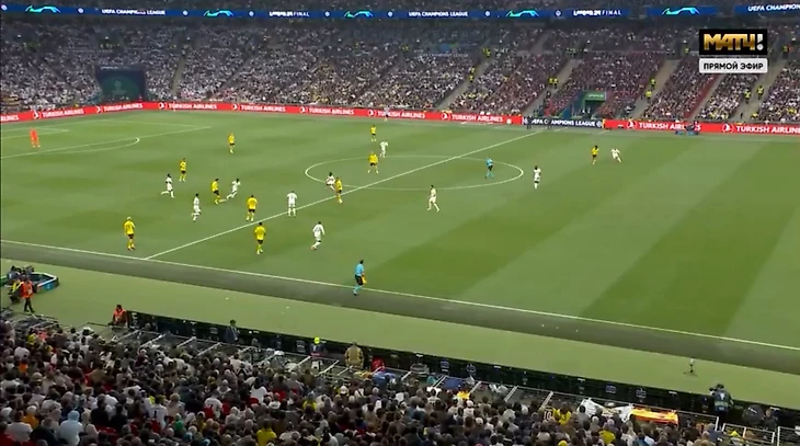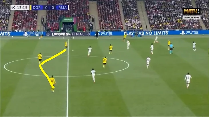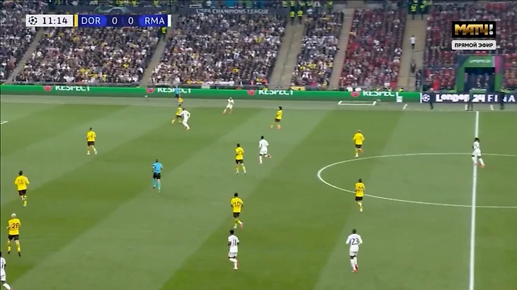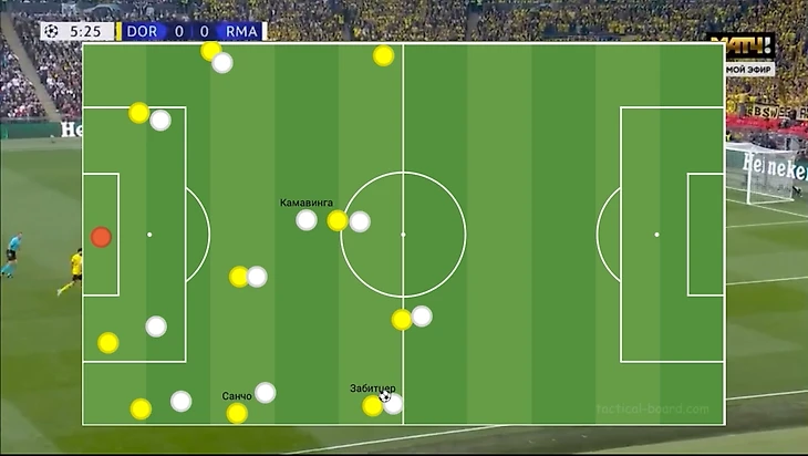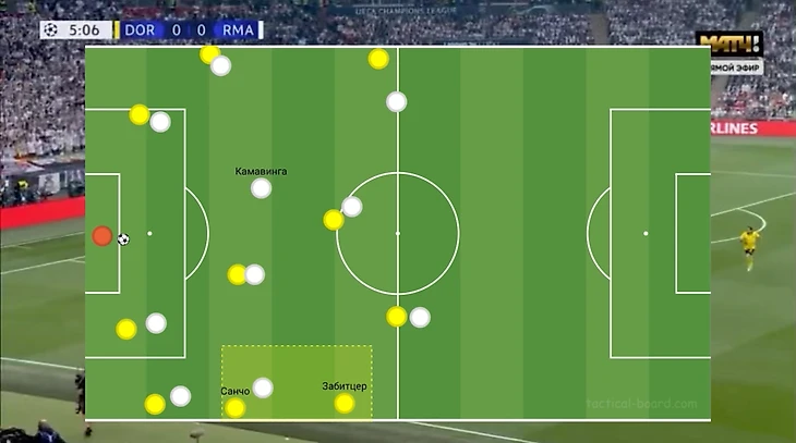 Реал сразу полез в прессинг, чтобы обозначить свое превосходство, ну и мяч забрать под владение. Боруссия, в свою очередь, пыталась выйти с переменным успехом. И вот тут сразу же отмечаю крутую задумку Терзича с этим прессингом. С механизмом все понятно, верхняя шестерка идет каждый в каждого, и вот достаточно сложно из-под этого выбраться, на это и был расчет Карло.