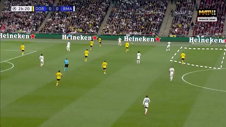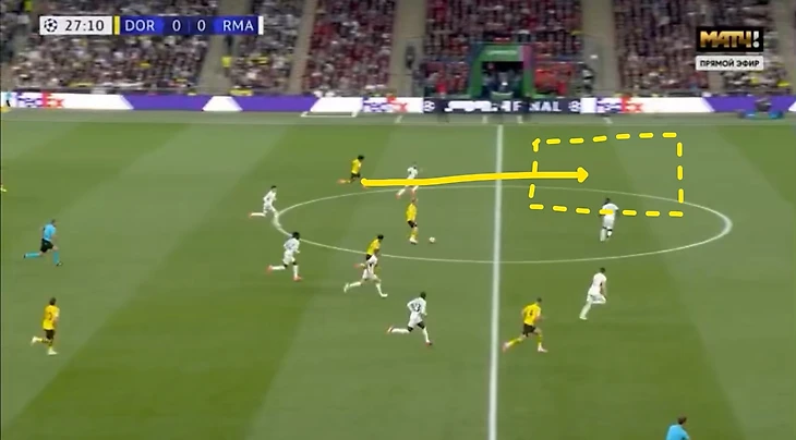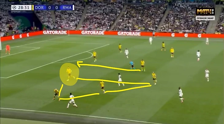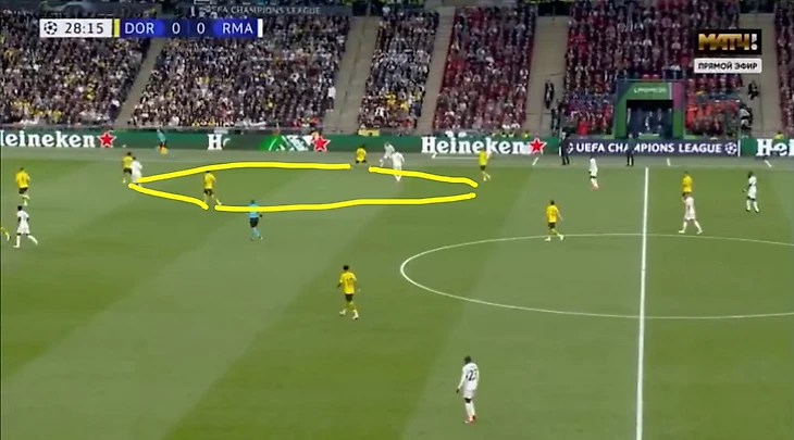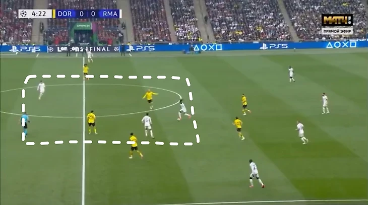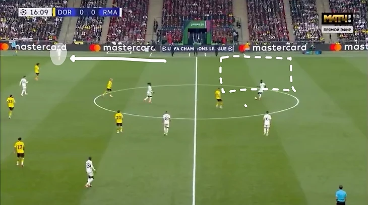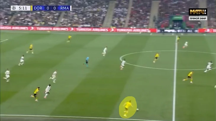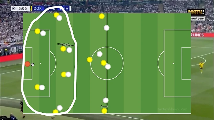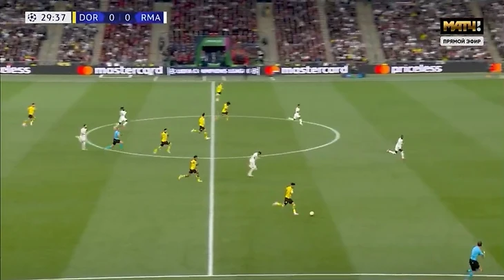 И вот кажется, что у Реала все ок, осталось дождаться момента для гола, но Боруссия не просто так играла в финале Лиги Чемпионов. Во-первых, все та же крутая идея в защите, где на флангах образовывалось большинство, слева за счет опускания Адейеми и Брандта, и при попытке подать тоже все надежно было.