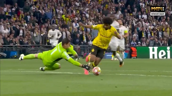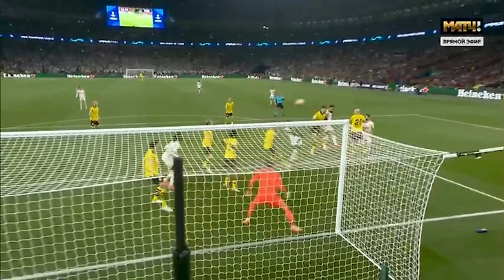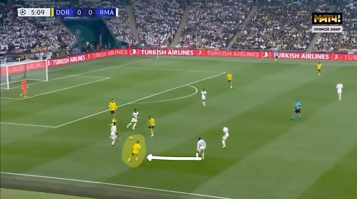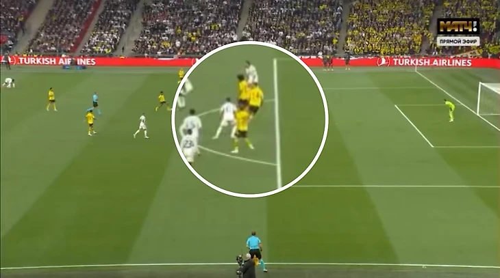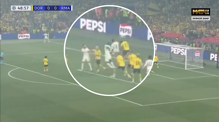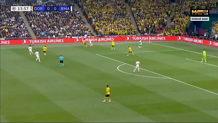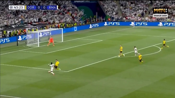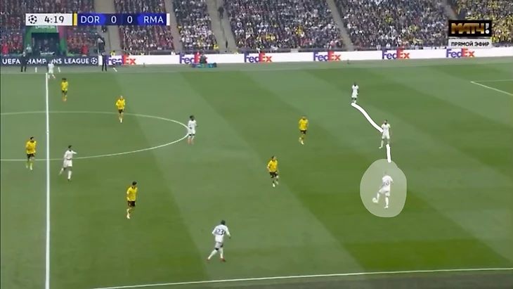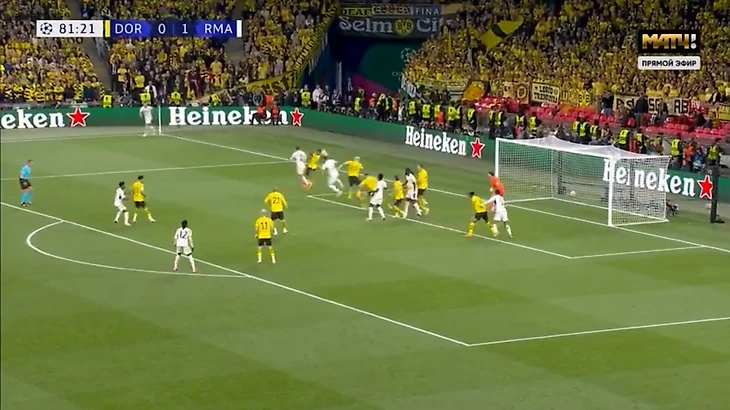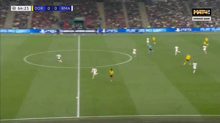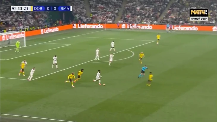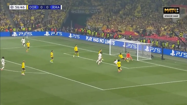 Интересное решение от Терзича, ну и в целом, Боруссия была нацелена подловить Реал на игре за спину защитникам, особенно учитывая как круто открывается Фюлькруг, именно за счет этого Боруссия создавала очередные моменты, ну вот посмотрите, как он круто так сказать зацепился за линию офсайда и уже готов забивать, очень круто от немецкого форварда.
