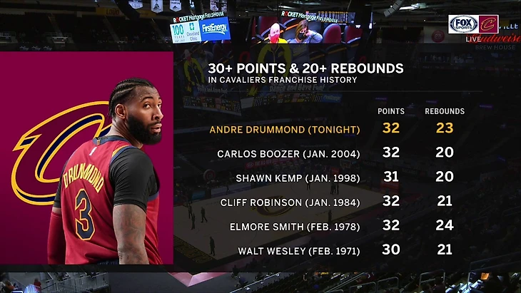 Лучшими у Кэвс были Драммонд (33 очка и 23 подбора) и Осман (25 очков). По поводу результата Драммонда можно отметить, что в последний раз игрок Кливленда набирал 30+ очков и 20+ подборов в 2004 году. А собственно вот все подобные результаты у Кэвс: