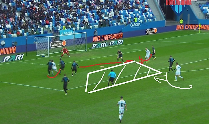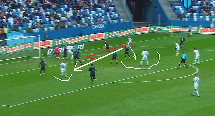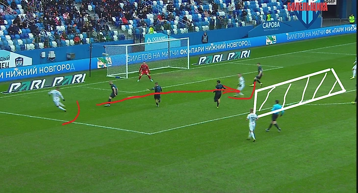 Второй момент. Далее следует сам катбэк (пас назад). Вот тут мы видим умение Дзюбы отрываться от защитника. Движение назад делается именно в момент паса, чтобы опекающий его защитник не успел перенести корпус. А защитники нижегородцев постоянно забывают о возможности такого приема в игре. Стремятся «забежать» в ворота. Прижимаются к воротам, что приводит к образованию пустой зоны в районе линии штрафной площади.