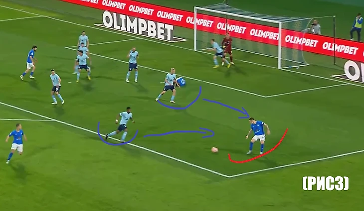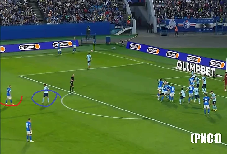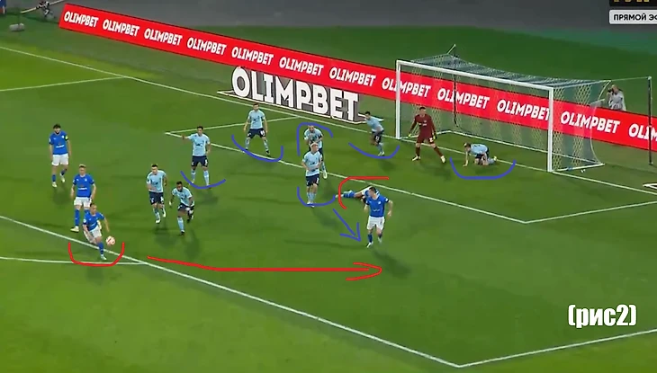 Итак, происходит навес с углового от хозяев матча. Верховую дуэль выигрывает капитан нижегородцев Гоцук. И хотя на линии штрафной барражирует игрок гостей, но мяч достается футболисту «Факела», и он отправляет мяч сразу обратно в штрафную. Вот тут первый нюанс. Почему заведомо находящийся ближе к мячу Рыбчинский не успевает первым на подбор? При этом именно он опекал Калинина в момент навеса (рис1). Уже не доработка.