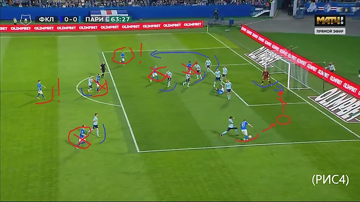 Ка мы можем видеть, даже, если бы Янсане в последний момент убрал ногу или вообще её не выбрасывал, а просто обозначил отбор, то Морозов обойдя нижегородца получал мало успешных вариантов дальнейшего развития (рис4). Это или навес на дальнюю, но возможно там успел бы сориентироваться Стоцкий, или совсем безумный пас назад (катбэк) на свободного партнера далеко за пределами штрафной, или удар в ближний, но тут вратарь должен был спасать. Так что успешных вариантов продолжения развития момента было не много и со всеми защита «Пари НН» вполне могла справиться.
