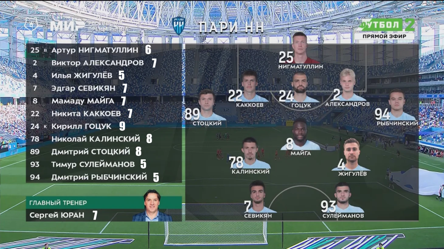 Калинский – 8, отличное возвращение в команду. В меру возможности помогал сзади и контролировал все атаки нижегородцев. Стандарты вроде получаются, но не хватает каких-то миллиметров.