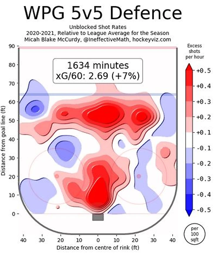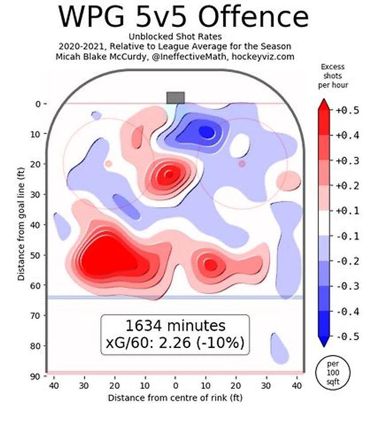Я уже писал об этом в начале прошлого сезона и с тех пор существенно ничего не изменилось. «Виннипег» все так же в равных составах создает моментов меньше, чем в среднем по лиге.