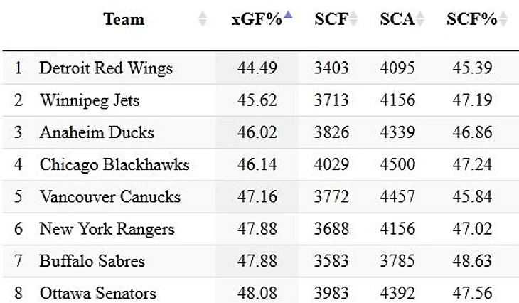 Вот, для примера, десятка худших команд НХЛ по показателю xGF% за последние три сезона.