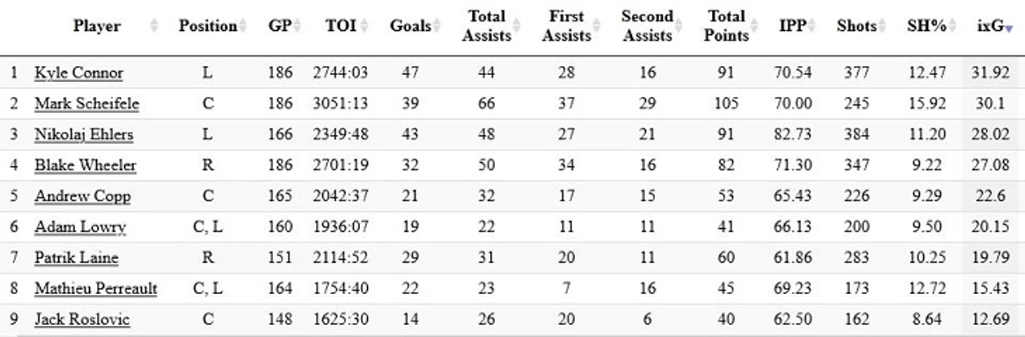 Третья причина частично перекликается со второй и это наличие в составе нападающих, способных делать голы даже из полумоментов, причем не только в большинстве, но и в равных составах. Ниже таблица ожидаемой индивидуальной результативности форвардов «Джетс» при игре в равных составах за последние три сезона.