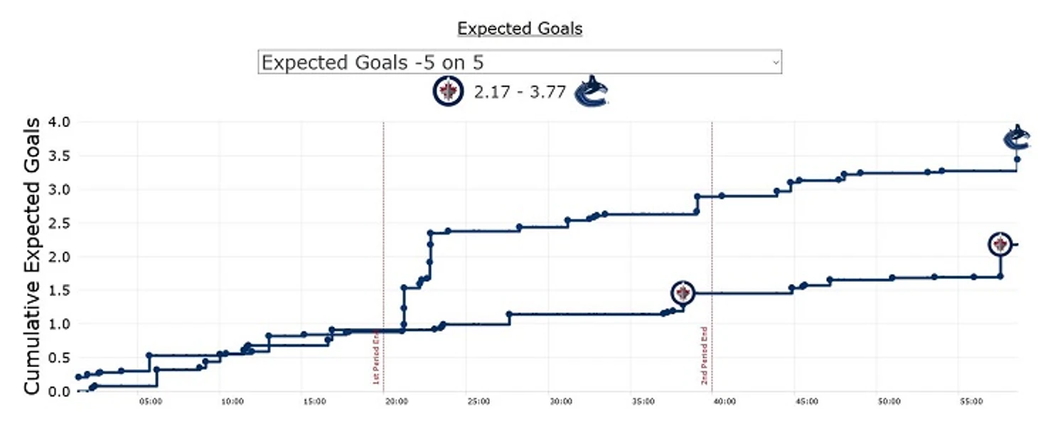 Во второй игре в равных составах «Ванкувер» наиграл почти на 4 ожидаемых гола, хотя забил всего лишь один, да и то в самом конце, когда все уже было ясно. А «Виннипег» забросил ровно столько, сколько положено по показателю xG. А счет при этом 5-1 в пользу «Джетс».