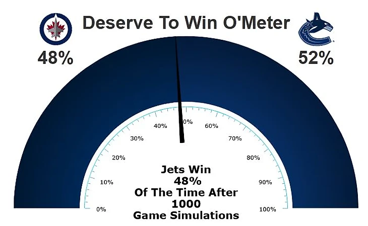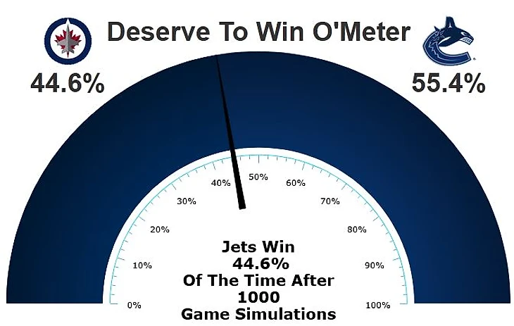 Взять, к примеру, два недавних матча против «Ванкувера», которые «Джетс» выиграли со счетом 4:0 и 5:1. По результатам может показаться, что в этих играх было тотальное доминирование и аннигиляция соперников, но это не так. Обратимся к такой функции сайта Money Puck, как шакала «заслуженности победы». Она складывается из 1000 симуляций матча на основе всех статистических событий, которые произошли в игре. И окажется, что оба матча были в принципе равными, и в обоих победу, пусть и ненамного, заслуживали «Кэнакс».