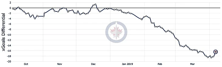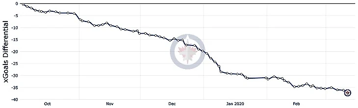 И я с точностью до недели могу сказать вам, когда у «Джетс» что-то сломалось в игре без особых на то причин. Случилось это еще до того, как команду покинули все ведущие защитники и руководству команды пришлось перекраивать состав обороны буквально на лету. Что-то случилось в январе 2019-го года и с тех пор «Виннипег» катится по наклонной в плане соотношения ожидаемых голов и нет никаких предпосылок, что этот тренд поменяется. Вот график показателей разницы xG в отдельно взятом матче, но идущий нарастающим итогом. Ну, или в случае с «Джетс», убывающим.