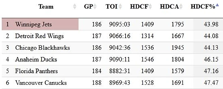 Если брать последние три сезона, то «Джетс» являются абсолютно худшей командой НХЛ по соотношению голевых моментов в непосредственной близости от ворот (HDC – High Danger Chances).
