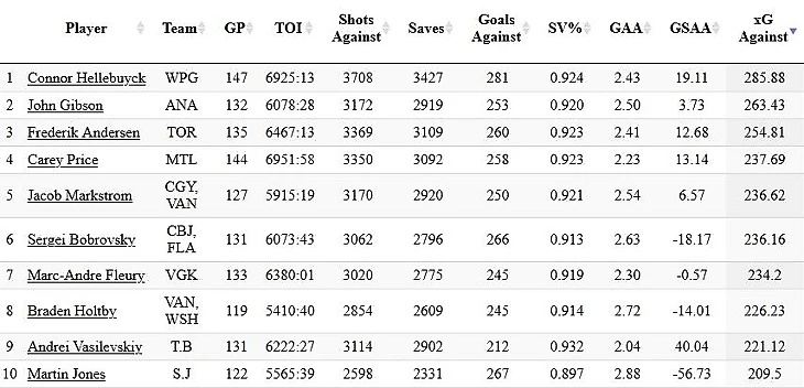 Защита «Виннипега» стабильно обеспечивает его работой. Коннор – самый загруженный вратарь лиги не только в плане количества бросков, но и по совокупной опасности этих бросков. Ниже представлена статистика за последние три сезона, отсортированная по сумме ожидаемых голов в свои ворота в равных составах.