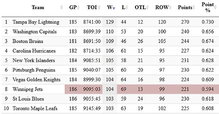 Все правильно, хуже «Джетс» по игре в равных составах выглядит только «Детройт», который находится в глубокой перестройке и откровенно сливает уже второй сезон подряд. Выше находятся даже «Баффало» и «Оттава», которых никак не причислить к претендентам на попадание в плей-офф в последние годы. А теперь посмотрим на количество побед на счету «Виннипега» за тот же период.