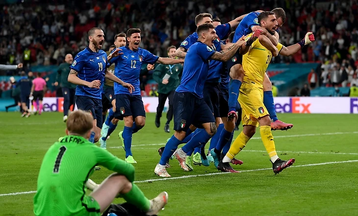 Второй бил Кейн, он не оставил шансов Доннарумме. Самое интересное было потом Пикфорд берет удар Белотти, а Магуайр точно в девять выводит Англию вперед. Стадион сходит с ума, счет 2-1 в пользу Англии. К мячу подходит Бонуччи и не мажет, а вся драма началась с удара Рэшфорда, он попал в штангу. Бернардески забивает, а следующий удар берет Доннарумма от Санчо. Картина переворачивается с ног на голову. Теперь 3-2 ведет Италия, и если забьет Жоржиньо, то Италия выиграла. Пикфорд отбил пенальти, и казалось вот оно чудо, все в пользу Англии. Нужно забивать и сравнивать счет в серии пенальти, но тут блеснул Доннарумма. Он отбивает решающий пенальти от Сака и приносит победу Италии. Его же потом и признают лучшим игроком турнира.