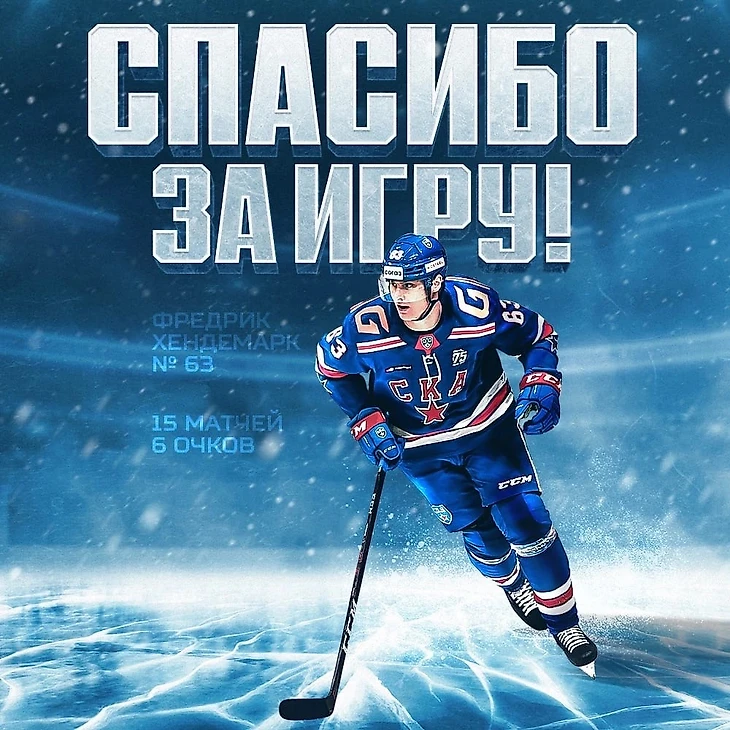 СКА покинуть центральный нападающий Хендемарк. Официально об этом объявили во время написания статьи. Изначально это подписание было не совсем понятно. В команде центров пачками можно солить, но подписывают ещё одного, да ещё и легионера. Швед больше разрушитель, и было бы логично создать сдерживающее звено, поставив его вместе с Тимкиным, Кетовым или Бардаковым. Но на Хендемарка видимо рассчитывали как на бомбардира. По итогу 6 (2+4) очков в 15 играх и рассторжение контракта.