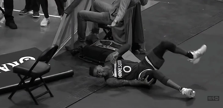 Д’Анджело Расселл упал в одном из тайм-аутов, попытавшись сесть на рекламный баннер.