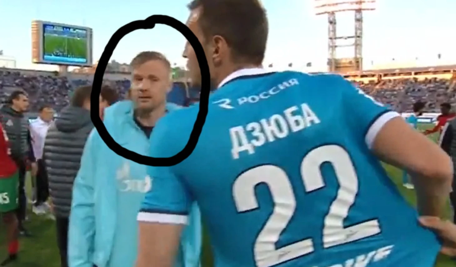 Обратите внимание на человека, который сдерживает Артема на кадре сверху. Дзюба не поймал Миранчука именно из-за него.