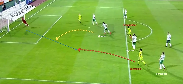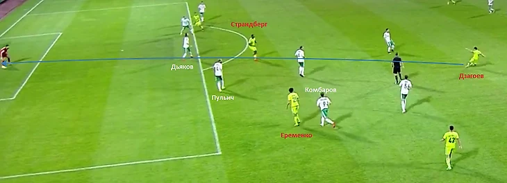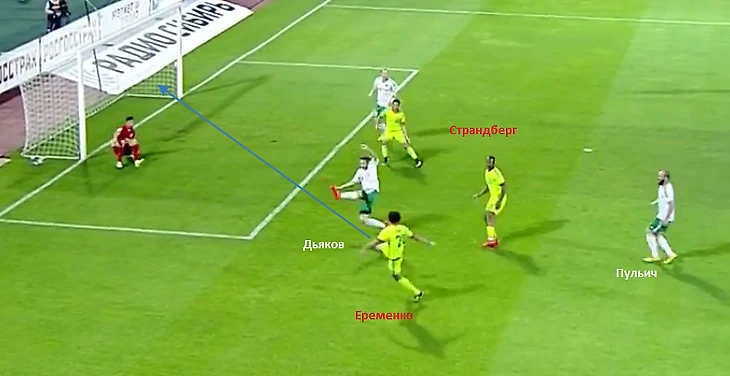 В этом моменте я постараюсь немного оправдать Дьякова. В момент удара Дзагоева за Романом Еременко следил Кирилл Комбаров, а Виталий контролировал действия Страндберга. После сейва голкипера полузащитник ЦСКА отрывается именно от капитана "Томи". Также стоит отметить действия Пульича, который не побежал к отбитому мячу.