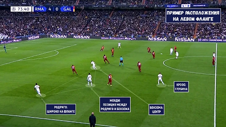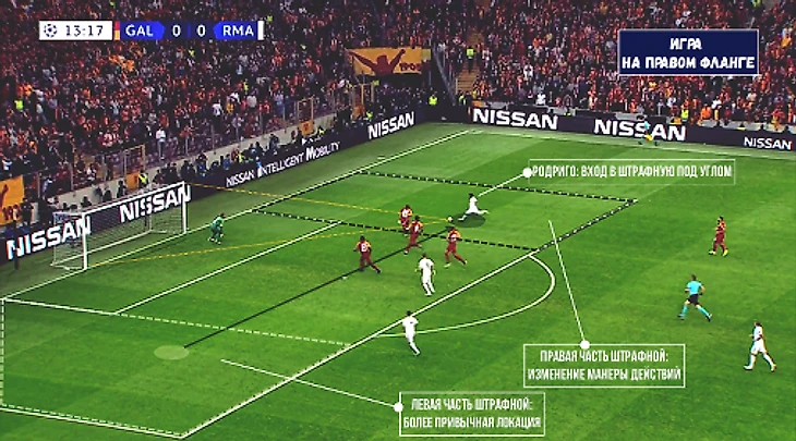Структура текущего игрового построения «Реала» помогает новичку еще и в том, что практиковать подобные переводы может весь «дальний» от Родриго сегмент схемы (Марсело, Кроос, Рамос, даже Азар пробует силы время от времени). Вывести талантливого бразильца на пространство – одна из опций, которую открывает само наличие быстроногого юноши в стартовом составе.