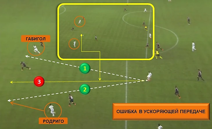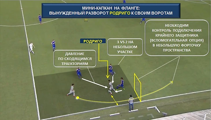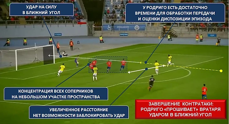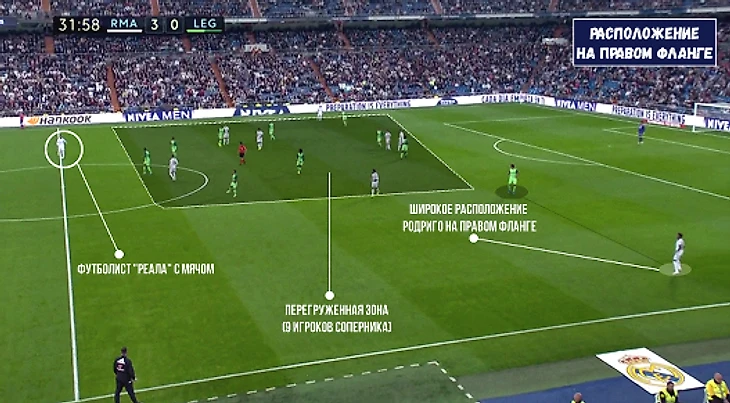 Следующий пункт: при мяче на левом фланге и концентрации противника на одном участке поля Родриго сознательно растягивает фронт атаки под длинные переводы: