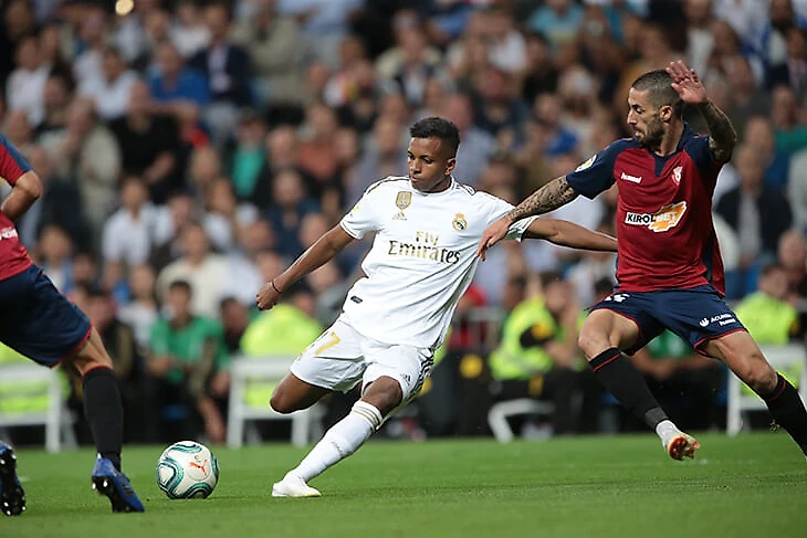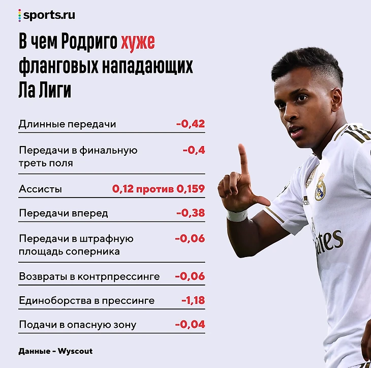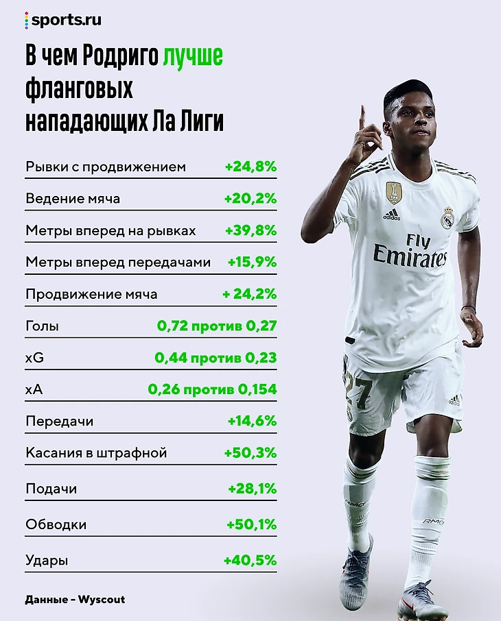 Действовать по алгоритму «отдал – взорвался на первых 5-6 шагах – получил мяч в ногу в нужной точке – получил лишнее мгновение для оценки ситуации – реализовал» эффективнее, чем ломиться в стену из соперников или вязнуть в механизмах подстраховки. Когда (или если) это понимание достигнет значительного прогресса, то комбинации, учитывая уровень партнеров по новому клубу, все чаще будут сами замыкаться на Родриго или Винисиусе как на заключительном звене голевой цепочки, в их репертуаре станет больше «простых» голевых шансов из лучших, тщательнее подготовленных позиций.