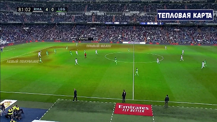 Активность правого фланга – «вытянутая», вдоль бровки и чуть дальше от штрафной площади соперника. Активность левого фланга – это касания, сосредоточенные на меньшей площади, ближе к полуфлангу и штрафной «Леганеса». На левый фланг Родриго иногда переключался и в те моменты, когда Азар на поле отсутствовал.