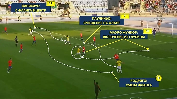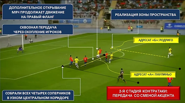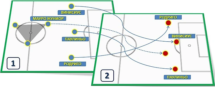 Доподлинно неизвестно, планировал ли Винисиус передачу именно на Родриго или же отдавал ее под рывок Паулиньо в штрафную и просто не вложил мяч последнему в ногу. Вариант «А»: получаем передачу «в спину» на Паулиньо, которая во многом по стечению обстоятельств дошла до дальнего адреса – Родриго. Вариант «Б»: Винисиус сознательно прокатил сложную сквозную передачу через целую толпу под замеченный им рывок Родриго. В любом случае, получилось как нельзя лучше, а общую композицию всей скоростной атаки данная передача только украсила: