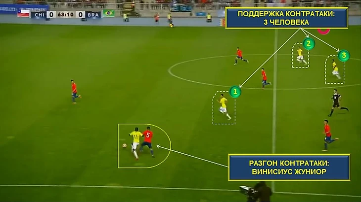 Далее рассмотрим эпизод переходной фазы, ключевая фигура в быстрых отрывах – Винисиус. Худший вариант для соперников, если атаку разгоняет именно он или Родриго: