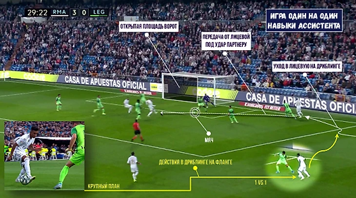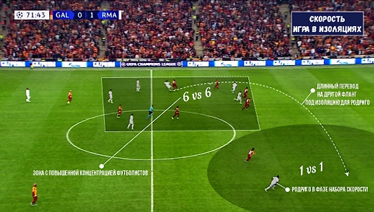 Прием понятный, создающий «Реалу» перевес на менее «населенном» фланге, а когда у человека в условиях изоляции (игра 1 в 1) и с индивидуальным превосходством в скорости появляется пространство, то переключение работает еще эффективнее: