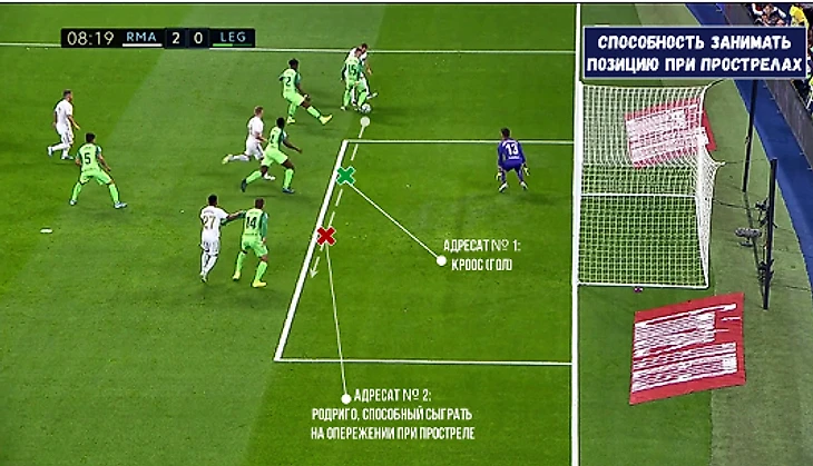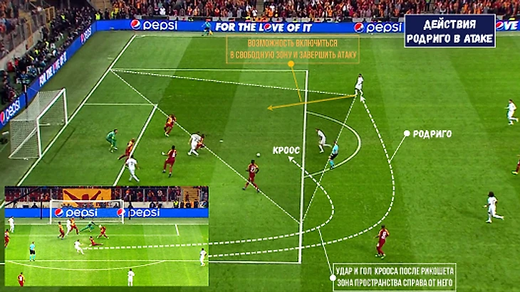 Кроос завершает эпизод голом через рикошет, но необходимо отметить и позицию Родриго: он стоит и наблюдает в тот момент, когда простое ускорение в штрафную дает немцу дополнительный вариант – скатить мяч на пространство под удар Родриго. Несомненно, человек с ударом Крооса из подобной позиции чаще всего будет именно пробивать, а не искать улучшающую передачу (так называемый экстра-пас), но открыть партнеру такую опцию в конкретной ситуации Родриго мог бы.