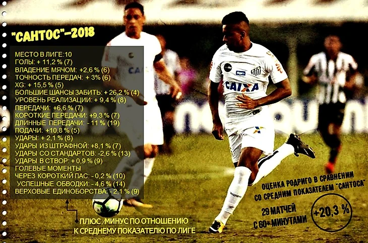 Дополнительно на изображении представлена личная статистическая оценка игры Родриго (в 29 матчах с 60+ минутами) в сравнении со средним уровнем командной оценки «Сантоса» в тех же самых играх. Анализируя личные оценки Родриго, можно сделать вывод, что примерно половина из них (15) ниже уровня командной оценки, другая половина – выше, а общий прирост обусловлен тем, что в некоторых отдельных случаях наш герой выглядел чрезвычайно ярко. Вывод: свойственные юности вспышки таланта сменялись уходами в тень, в стабильности выступлений нужно прибавлять.