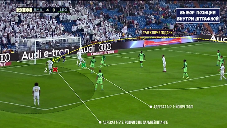 Автор гола – замкнувший навес Лука Йович, однако «следующий на очереди» по линии передачи – вновь юный бразилец. В данной ситуации есть вопросы по офсайду у Родриго, но: а) пространство на дальней штанге обнаружил; б) очередь на гол за Йовичем «занял»; в) в нужную точку вышел, пусть и с возможным опережением. Возвращаясь к поиску вариантов взаимодействия с Бензема (отдал и открылся под обратную передачу):