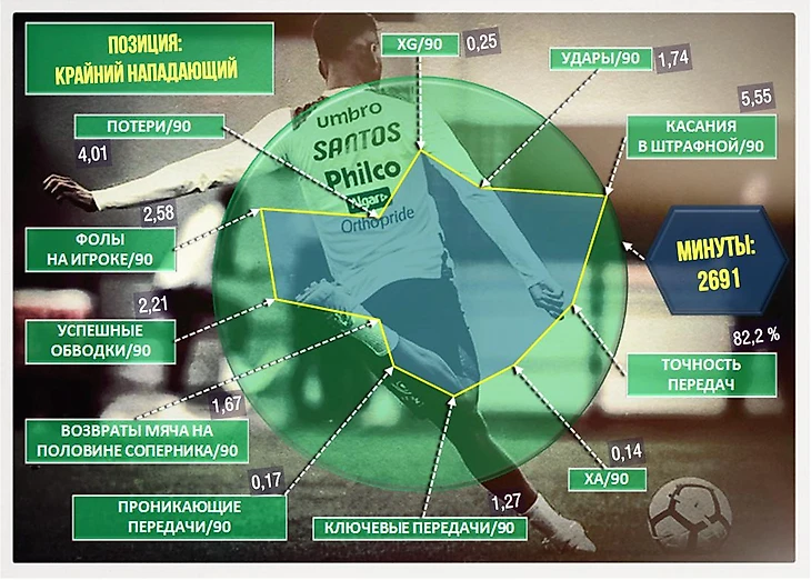 Классический статистический радар для позиции «крайний нападающий», область внутри круга – это соответствие ключевых показателей нашего героя элитным для данного амплуа: