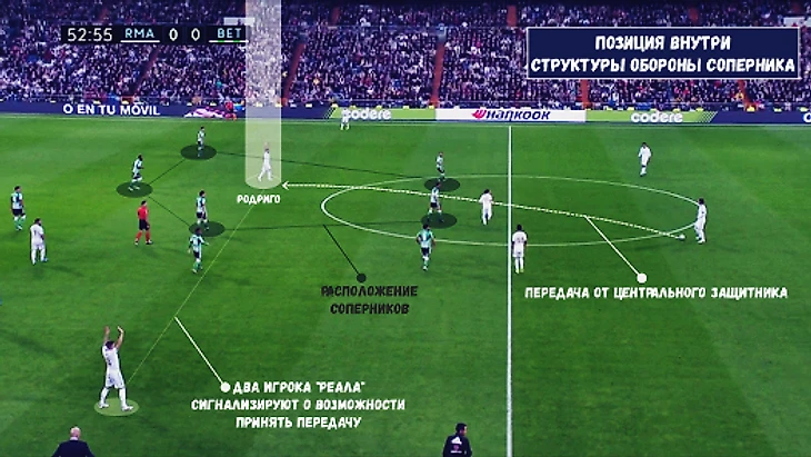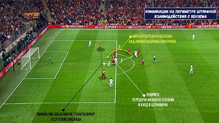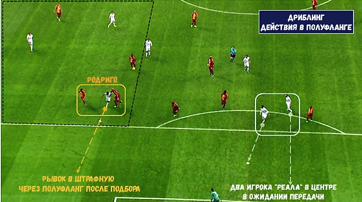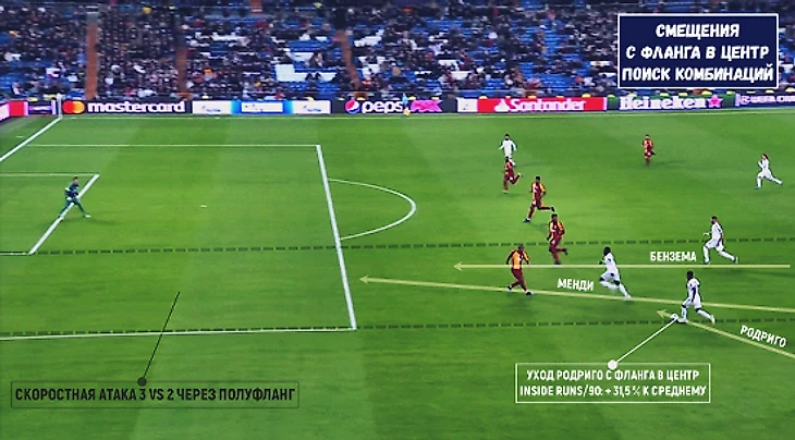 Второй момент: Бензема – форвард, который в поисках мяча может активно перемещаться, обладает навыками подыгрывающего элемента атаки. Заполнять центр, выходить под прострелы в зону между вратарем и линией обороны соперника в таких эпизодах – одна из задач остальных игроков «Реала», а теперь – и Родриго.