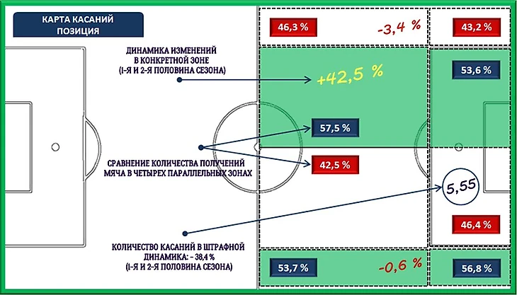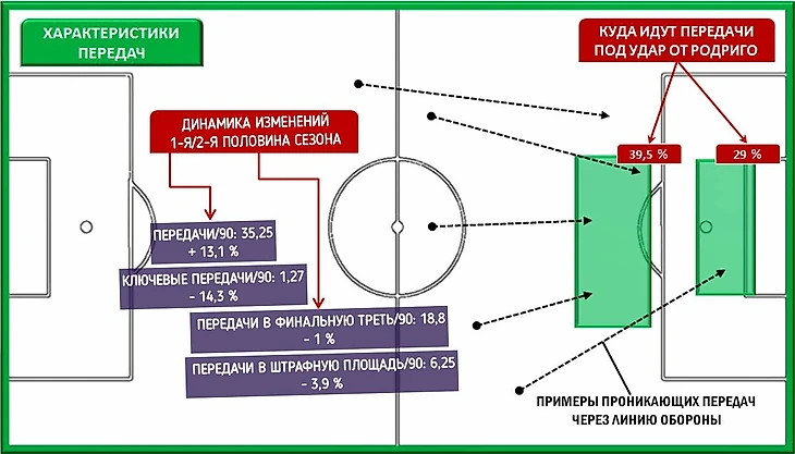 Отмечены отдельные примеры проникающих передач, формирующих наиболее опасные возможности для команды забить гол. Зеленым цветом обозначены основные направления передач под удар партнерам, то есть насыщение двух центральных зон в созидании (почти 70 % от общего объема обострения). В левой части изображения – количественные характеристики паса, отражающие как число передач разных типов, которые Родриго отдает в рассматриваемые зоны, так и динамику изменений от первой половины сезона ко второй.