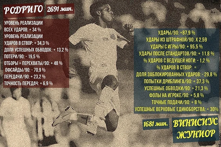 Полный сезон Родриго и два неполных сезона Винисиуса. Одна среда сопротивления (чемпионат Бразилии последних двух сезонов, без учета матчей Винисиуса за «Реал»), приблизительно одинаковый возраст (Родриго младше на 6 месяцев), все показатели пересчитаны на 90 игровых минут. Если все-таки исходить из представленных данных (выборка не столь обширная, но наиграть больший объем минут в родном чемпионате ребятам не позволил их возраст), то Винисиус чаще превосходит будущего партнера по «Реалу» по количественным параметрам, а Родриго – по качественным. Впрочем, читатель вправе сам интерпретировать данные и делать самостоятельные выводы, не забывая с осторожностью и контекстом относиться ко всем статистическим выкладкам.