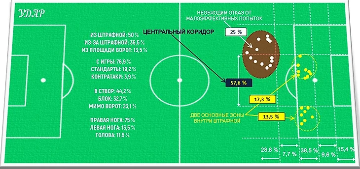 Выделены две основные зоны опасных ударов (желтым цветом), на карту не была нанесена еще одна локация, но ее стоит упомянуть отдельно – зона прямо на границе вратарской площади (7 ударов), это замыкания прострелов и добивания. Темно-красная зона – сверхдальние или просто малоэффективные попытки, большинство из которых можно было «не брать» вовсе или же пытаться продлить эпизод иным решением, другую часть – тщательнее подготовить на продвижении вперед.
