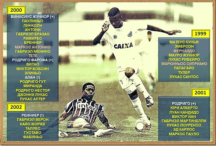 Естественно, автор наверняка забыл кого-либо значимого. Для справки: ребят, которые родились в 2000 году и позже, в Бразилии часто называют Geração Z («поколение будущего, нулевых»). Нет сомнений, что часть из этих парней не оправдает ожиданий и не выберется даже из Бразилии, вторая часть получит шанс и не воспользуется им в полной мере, третья – просто сделает очень хорошую карьеру в Европе, а кто-то и вовсе заблистает в силу заложенного огромного потенциала. Небольшое пояснение: белым цветом со знаком «+» выделены те бразильские таланты, которые уже сейчас находятся в системе мадридского «Реала», белым со знаком «!» – те, к кому «Реал» уже предъявлял предметный интерес (среди них выделяется Рейниер), еще одним цветом, оранжевым, свежий урожай известного знатока на бразильском рынке – «Шахтера».
