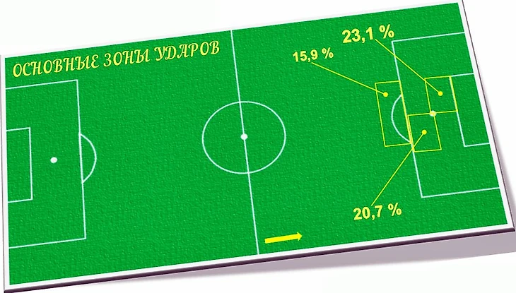 Неплохая разбивка по зонам для основной массы ударов (почти 60 % на три участка пространства практически по створу ворот).