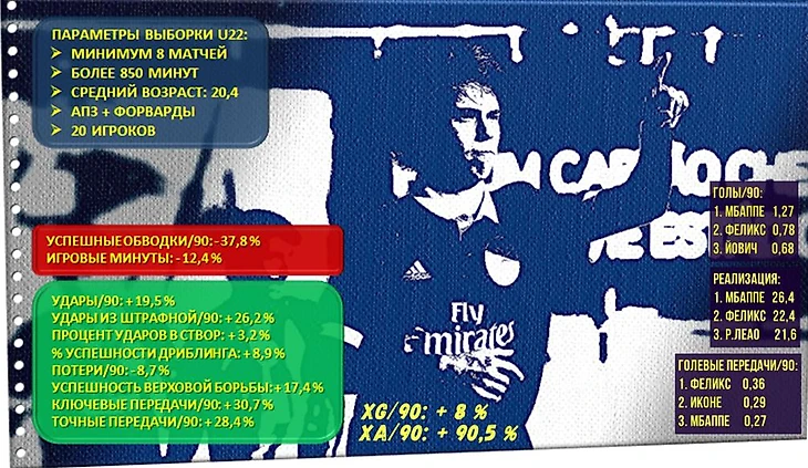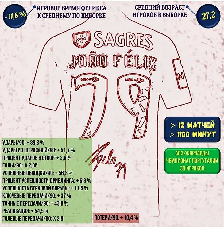 Небольшие вставки в правой части изображения - это ключевые показатели (голы, уровень реализации, голевые передачи), по которым Феликс входит в топ-3, если брать только юношей до 22 лет. Выборка в 20-30 полных матчей для молодых парней, может быть, и не слишком показательная для широкомасштабного исследования, в ней наверняка присутствуют «серые зоны», но задачу формулировал так: дополнительный угол зрения читателю не помешает.